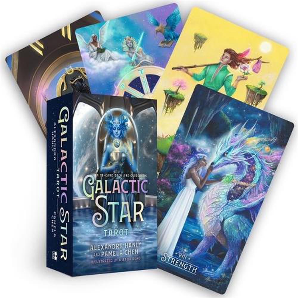 Explore the deeper meanings of tarot with a little help from your Star Guides, an extensive array of Star Beings from diverse places across the Milky Way galaxy. In THE GALACTIC STAR TAROT, you’ll meet the Lyrans of the Wands, the Pleiadeans of the Cups, the Sirians of the Swords, and the Arcturians of the Disks who’ve sworn to protect and support you and all other humans and Starseeds on Earth. Intricately detailed art takes you from the desert of Area 51 on Earth to royal courts held upon starships and everywhere in between. When you reconnect to memories of your galactic history and the infinite potential of the Universe, miracles happen. Activate the star magic within you and awaken to a new realm of abundant blessings.