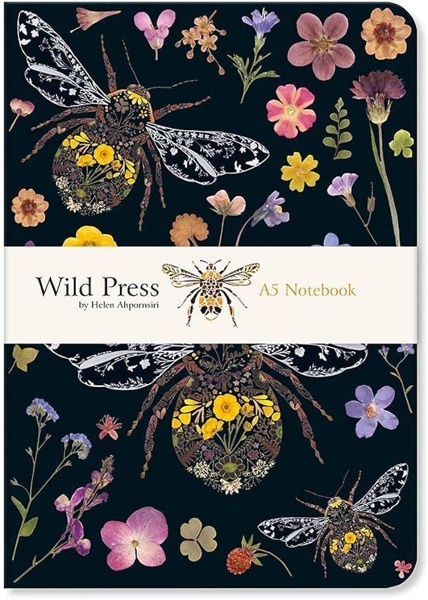 Helen Ahpornsiri works with a variety of flora, preferring fern and wildflower species. Flowers commonly considered weeds are unassuming yet familiar, they can be embued in folk tales and personal connotations which resonate with people in different ways. She is interested in the idea of preserving plants like these and giving them a new narrative. This beautiful notebook journal is bound with coloured stitching and features a printed wraparound cover of three bumblebees made from pressed flowers on a dark background. Three Bumblebees notebook contains 160 lined pages, color endpapers, soft-touch cover and lays flat for easy usage.