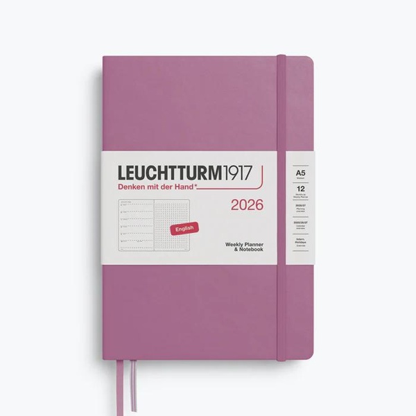 The A5 Dusty Rose Leuchtturm1917 weekly notebook diary is a simple yet functional companion for 2026. Every page features the calendar week on the left and a dotted notebook page on the right.
